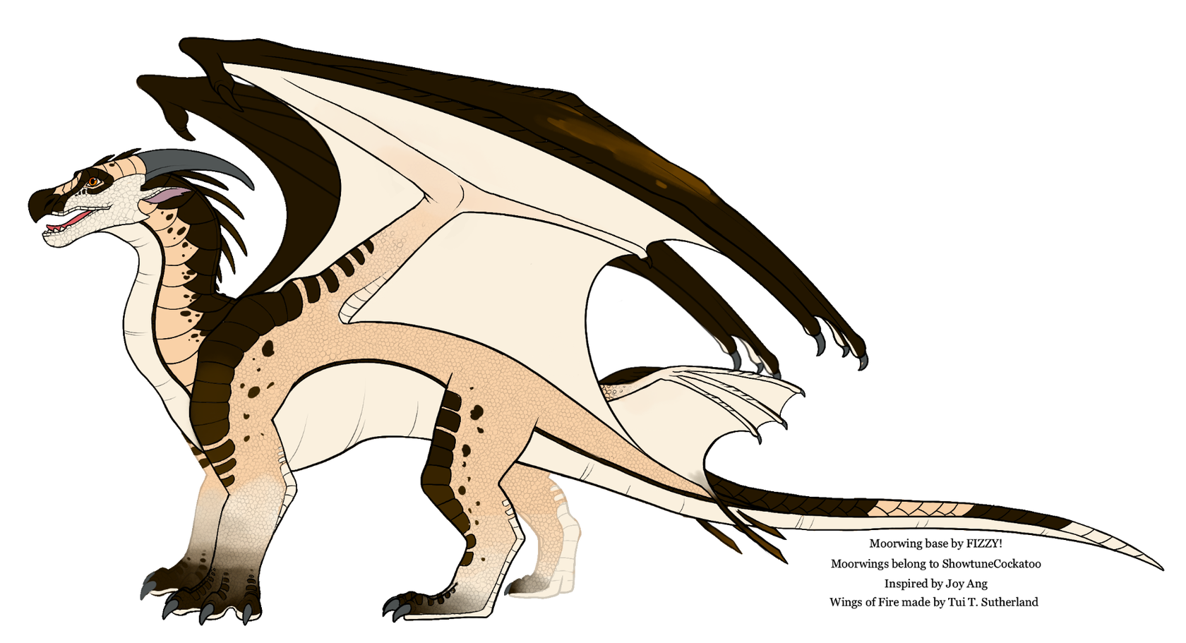 Description: MoorWings are small, often intricately patterned dragons which live across the plains on the eastern side of Pyropyga. They come in a variety of colors, usually with paler underbellies, aiding them in camouflage. Their dorsal fins and long, thin tails aid them in quickly cutting and turning in flight. MoorWings are a diverse species, with a large variety in horns, colors, patterns, etc. They are low-gliding fliers, expert tunnelers, and swift runners. They have powerful, curled talons for gripping the ground and prey as well as for tunneling. Their neck bears a row of quill-like spines, crucial to MoorWing body language. MoorWings are clever and adaptable, able to utilize all the resources around them